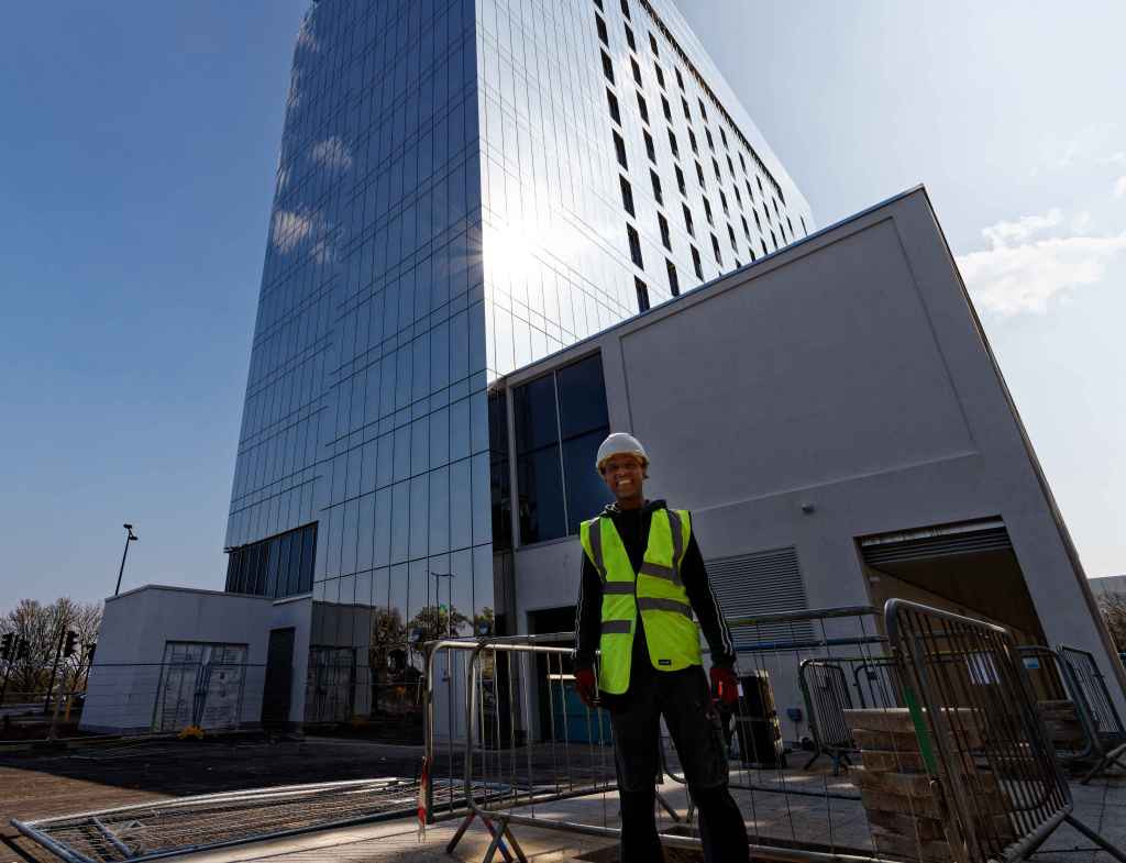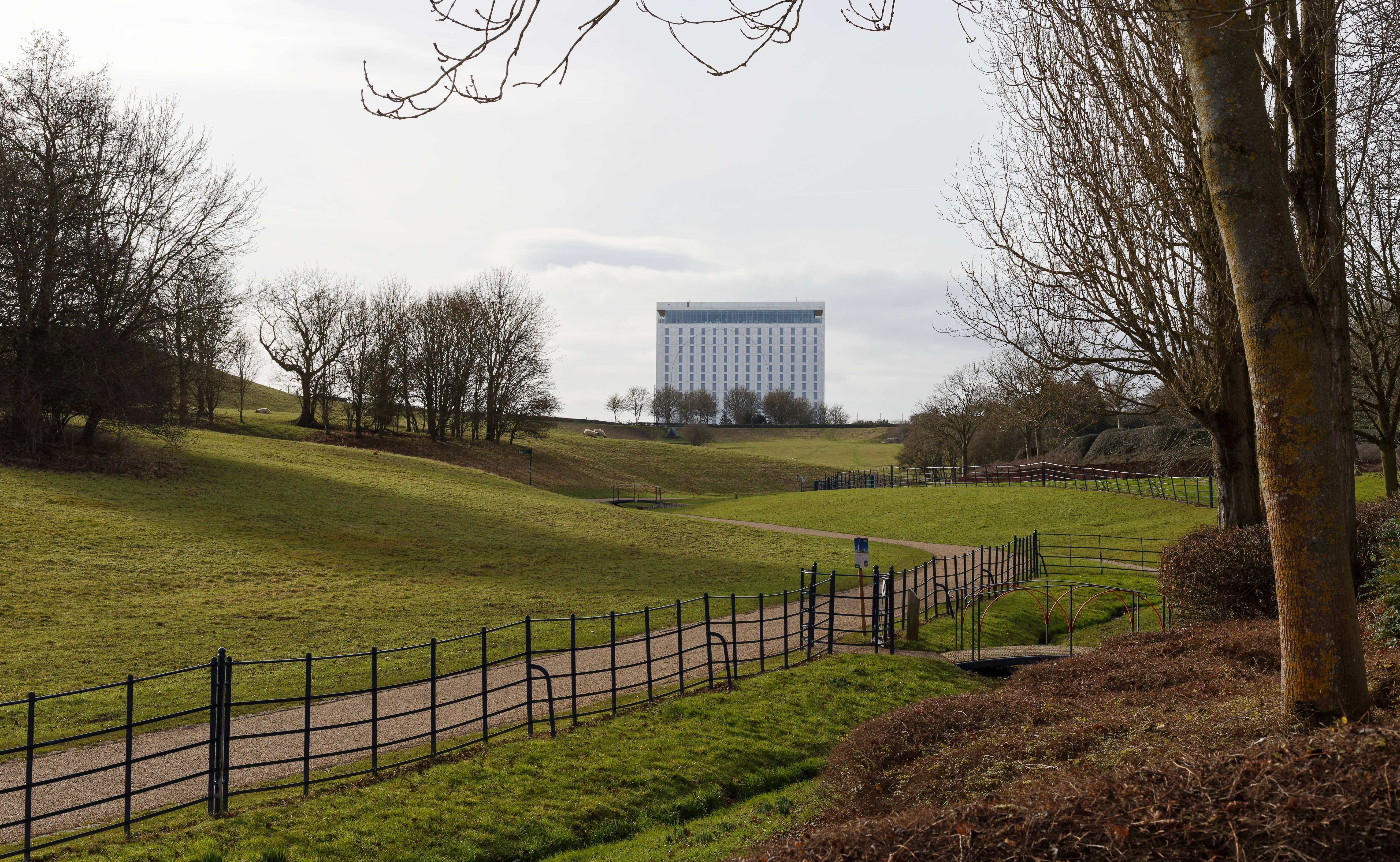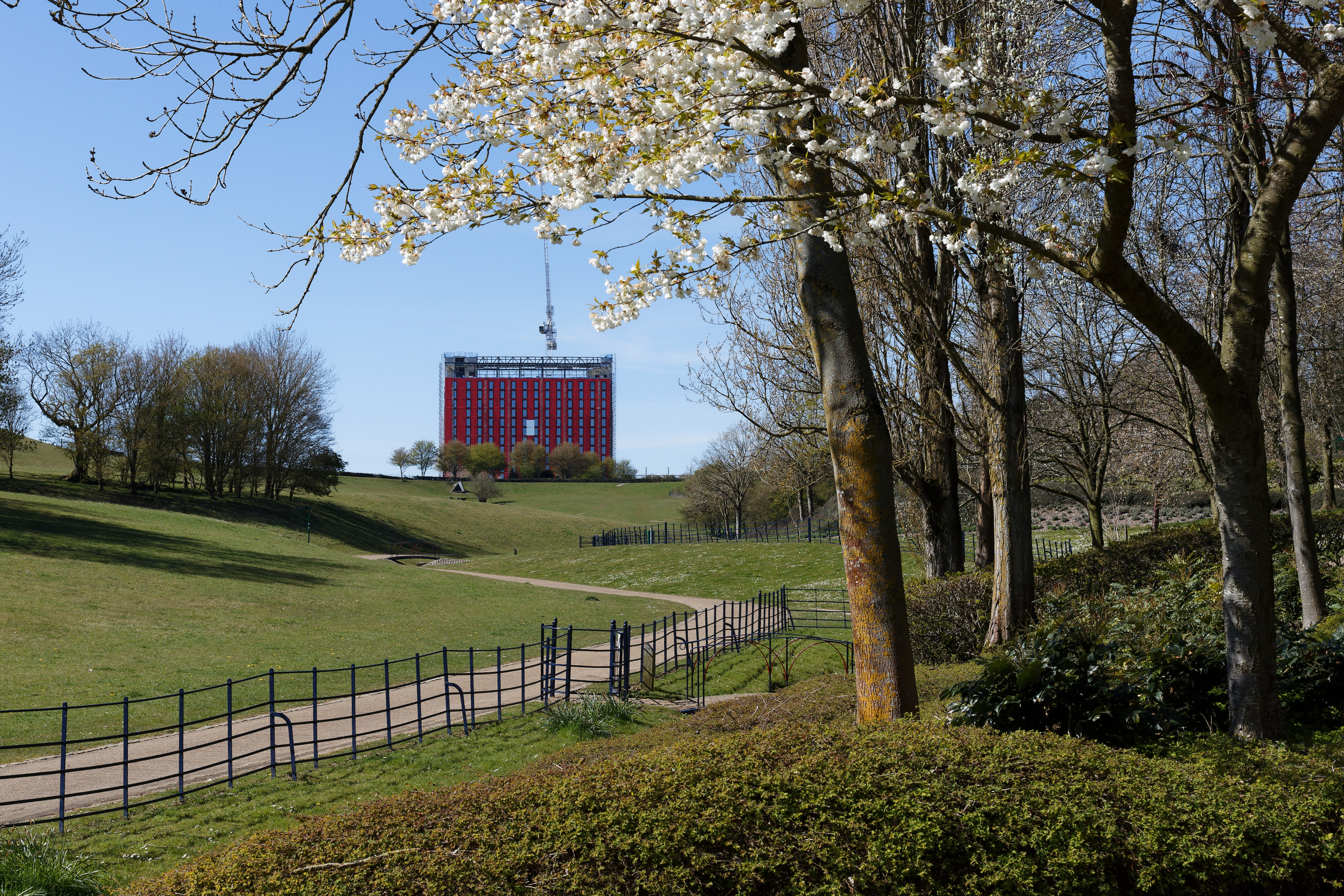 This is a picture of the Hotel LA TOUR under construction in Central Milton Keynes. I took the picture to indicate how it dominates Campbell Park. Although red at the moment I understand the final exterior will be stainless steel with a mirror finish and a 30-metre diameter stainless steel circle with a satin finish will form part the façade facing the park